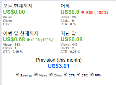 지금 블로그는 죽어있다가 다시 살아난거나 마찬가지다보니, 수익이라고 하기엔 거의 미미한 숫자가 찍히고 있다. 그래도 찍히는게 어디인가. 이것을 한달 후에는 10배 그리고 100배까지 올려볼 요량이다. 내가 목표한바까지 하려면 아직은 한창 멀었다.