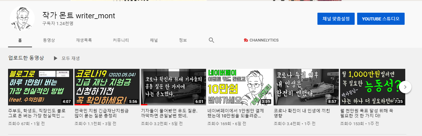 지금 운영하는 유튜브는 솔직하게 어부지리로 수익실현을 하고 있다는 생각이 든다. 최근 가장 이슈였던 코로나와 관련된 콘텐츠로 우연찮게 시작하게 되었는데, 계속해서 구독자가 쌓였고 수익창출까지 승인이 되어 현재는 수익이 조금씩은 쌓이고 있는 중이다. 지금까지 가장 많은 수익을 벌어다 주고 있다.